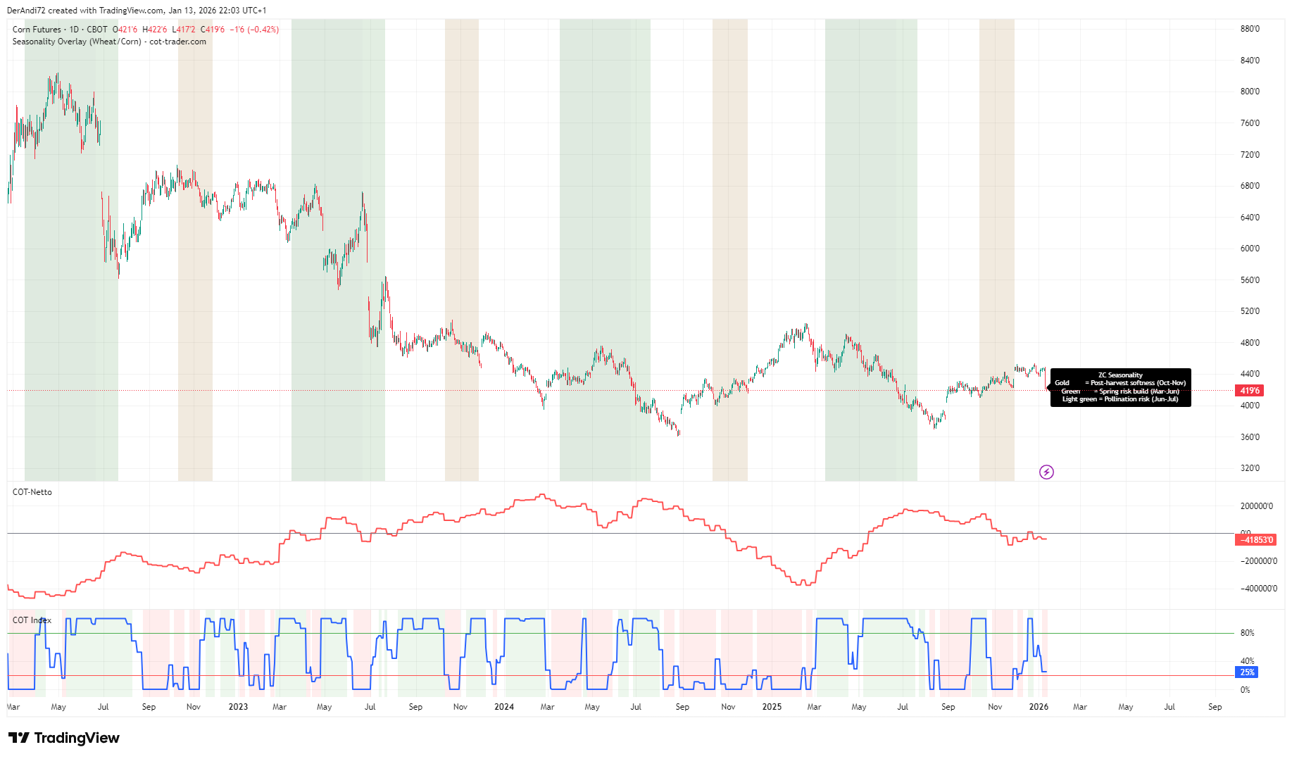 Especially in agricultural commodities like Wheat and Corn, this combination helps me stay patient, avoid overtrading, and align seasonal tendencies with real positioning in the futures market.